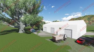 Складское помещение. Размеры в плане 24м х 30м, высота до низа несущих конструкций 7м, высота до конька 10,21м. Наружные стены и кровля выполнены из трехслойных стеновых панелей типа «Сэндвич» с утеплителем из минеральной ваты, толщина стен 100 мм, толщина кровельных сэндвич панелей 120мм. Каркас здания из стальных металлоконструкций, ориентировочно 39,6 тонн. В здании предусмотрены две входные утепленные двери размерами 2,1м х 1м, ворота подъемные размерами 4,5м х4м, и два окна размерами 1,5м х 1м.